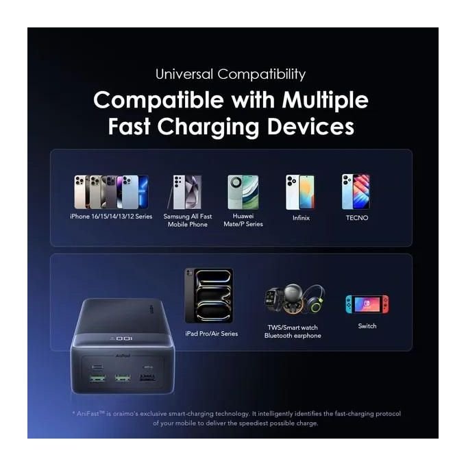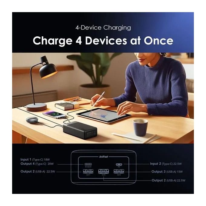 Compatible with Samsung, Apple, and more, it supports your multitasking lifestyle with 4 outputs, delivering efficient charging for multiple devices simultaneously.